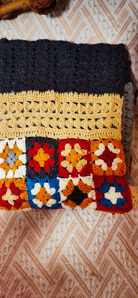 The scarf features vibrant and earthy colors—deep reds, blues, mustard yellows, and soft creams—that remind me of the picturesque landscapes of 普洱. The granny square pattern she used gives it a nostalgic yet modern vibe, while the craftsmanship and attention to detail make it truly unique.